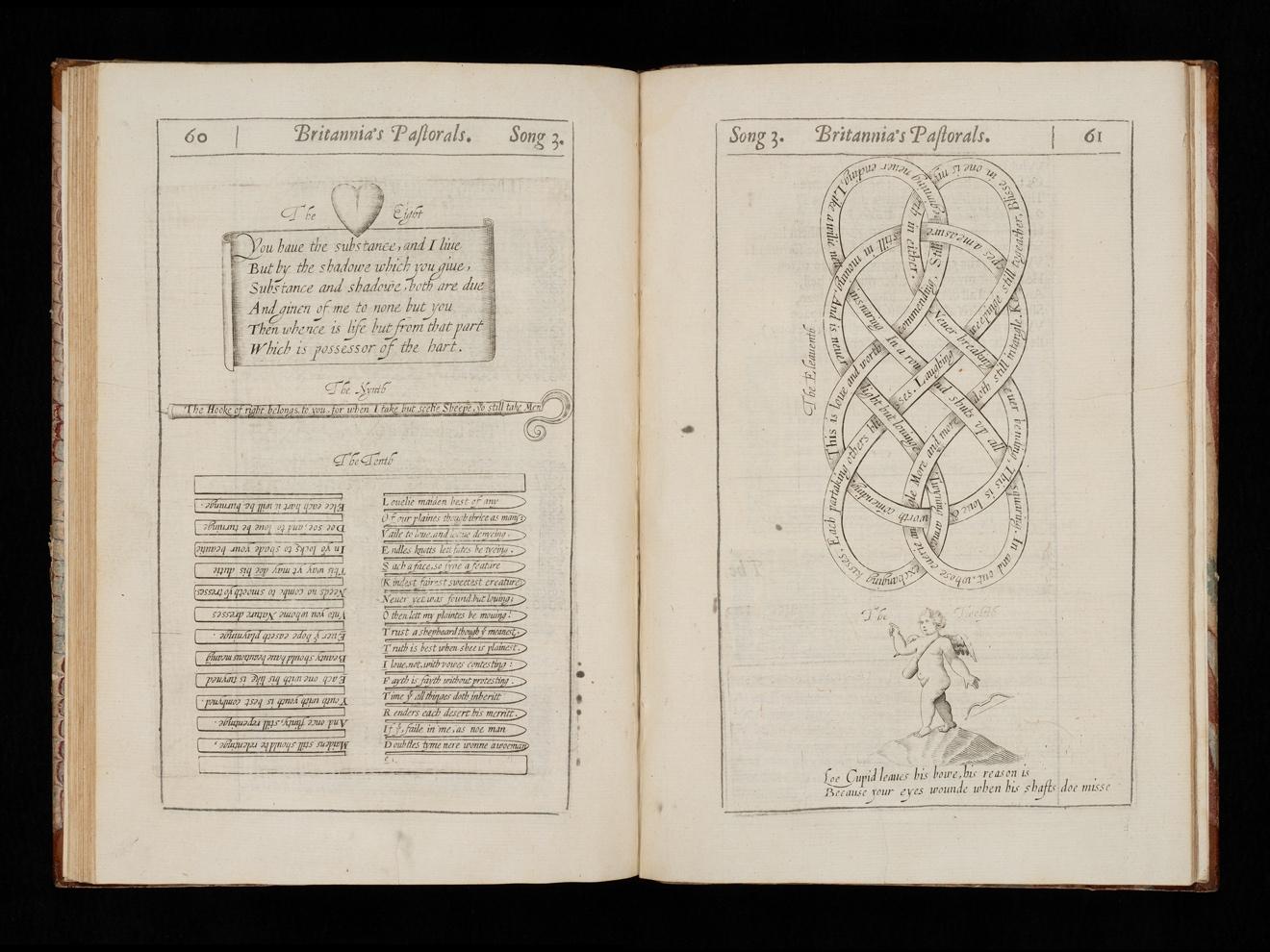 William Browne’s Britannia’s Pastorals (1613)—a long poem of tragicomic pastoral, satire, and elegy in three unfinished books—offers a more curious counterexample to these material poetics. In the first book, which is a work of national chorography akin to Drayton’s Poly-Olbion (1612) masquerading as pastoral romance, the tuning of shepherds’ songs to the landscape naturalizes the imperial voyeurism that motivates the poem. 16 When these shepherds “vnto the waters fals / Chanteth the rusticke Pastorals,” 17 they do so less to conjure an idealized world than to naturalize an ideological project in which songs celebrating England find sympathy in the landscape itself. It proves all the more strange, then, when a group of twelve shepherds’ posies appear in the poem as a set of increasingly elaborate engravings comprised of shepherding crooks, combs, and lovers’ knots. The only appearance of such a device in all three books, the engravings conclude an episode in which the lovesick shepherd Doridon stumbles across a scene of pastoral revels. In an explicit invocation of the Calender, Doridon has been mourning the loss of Colin Clout, remarking,