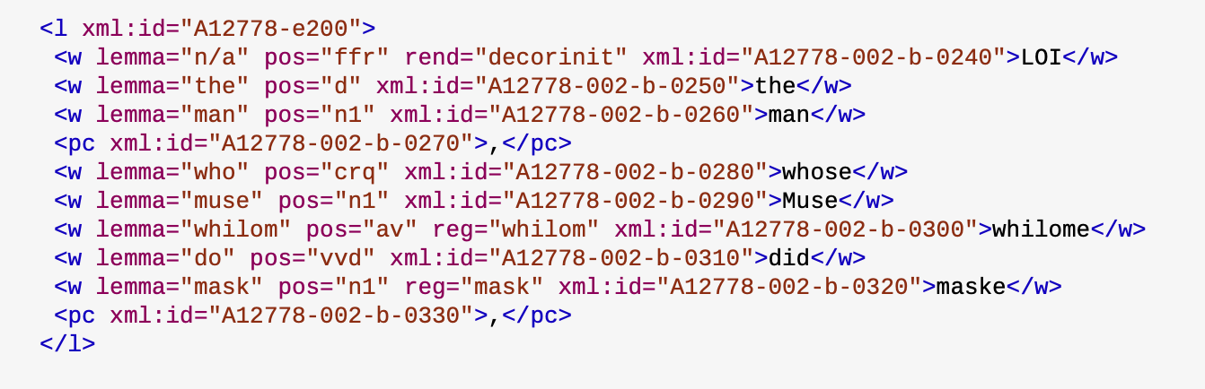 Consider the same line in EarlyPrint, where figure 4 shows that the long “s” has been normalized and each word has been assigned a unique identifier and lives within its own “w” element: