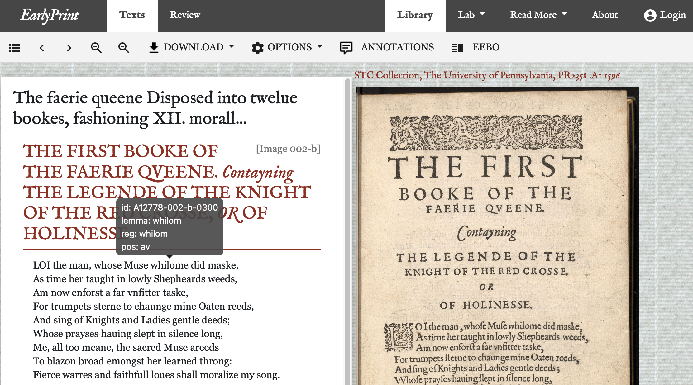 Selecting a text opens a reading pane with a display that can be paged through, but the codex metaphor is merely the foundation, with many other capabilities layered on top. 10 Hovering over a word reveals a tooltip with the word’s linguistic attributes, while an options menu allows switching back and forth between standard and original spellings. A “Downloads” menu allows the book to be downloaded in ePub or PDF formats for reading on a tablet or computer, but also makes available the raw XML that you may wish to use as a starting point for producing your own edition or as the data set for your own analysis. An “EEBO” link in the navigation bar will, if your institution subscribes, bring up the same page in EEBO. Figure 6 shows the opening of the 1596 Faerie Queene in the Library reading view with a word attribute tooltip displayed above “whilome” in line 1: