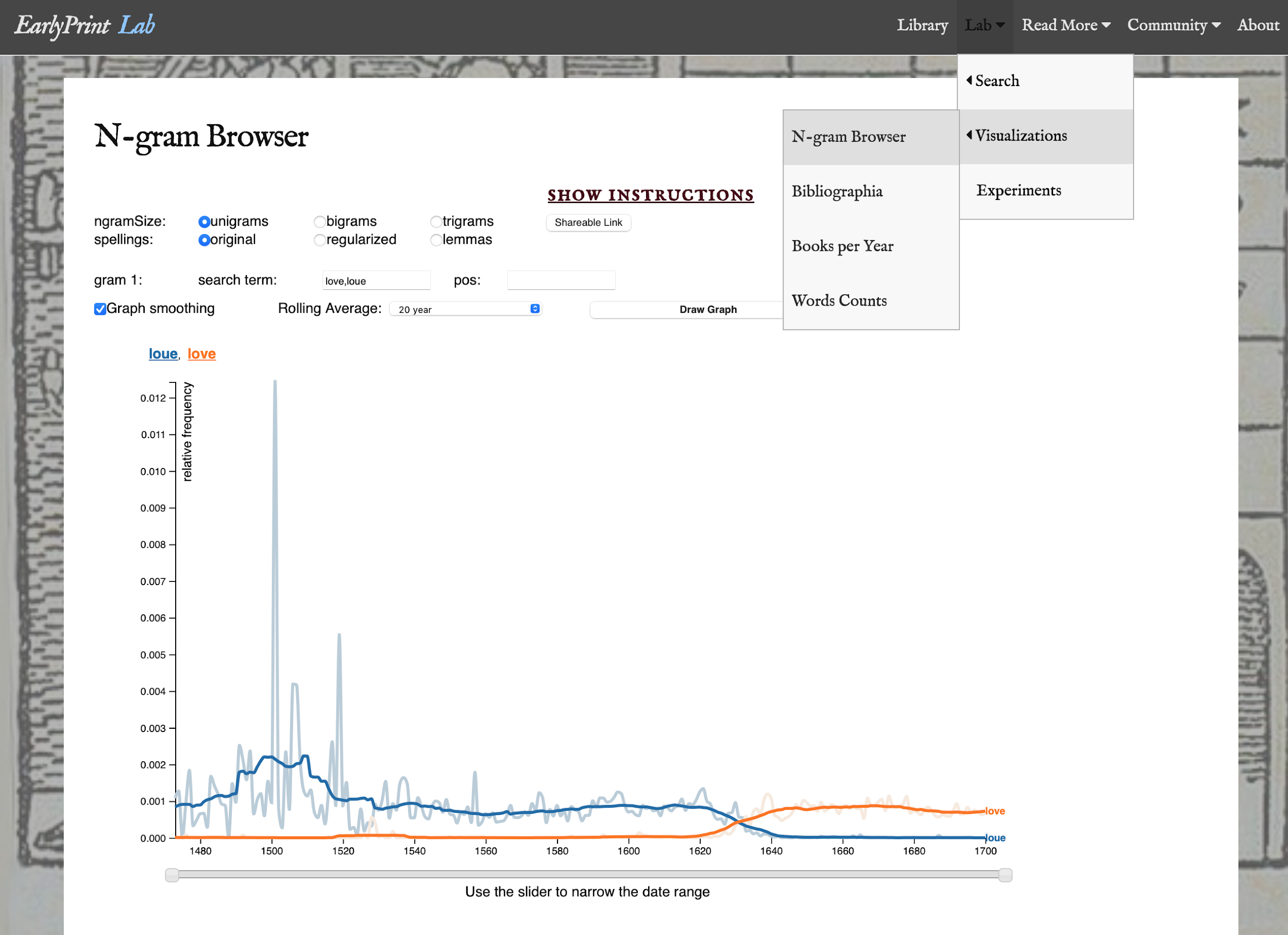 The Lab offers a range of quantitative modes of access into the EarlyPrint data, and while aficionados of statistical methods in linguistic computing will find much that pleases them, the entry points require no advanced mathematical or computational background to get started. For example, armed with categories no more esoteric than “spelling” and “year,” we can discover a great deal about how a particular spelling changed over time using the N -Gram Browser available from the Lab menu’s “Visualizations” section. The first time we navigate to the browser, it comes pre-loaded with the search terms “love, loue” and “unigrams” with original spellings chosen as input parameters. A unigram is simply an n -gram where the value of n is one, i.e., a single word, and by choosing original spellings we are asserting a preference to search word forms that have not been standardized, thus allowing us to see in the plot at the bottom of the screen, where relative frequency is the vertical axis, how the older spelling “loue” is on the rise in usage into the 1520s, levels off for most of the sixteenth century, is supplanted by the modern form “love” in about 1630, and is essentially gone by the early 1640s (see fig. 7).