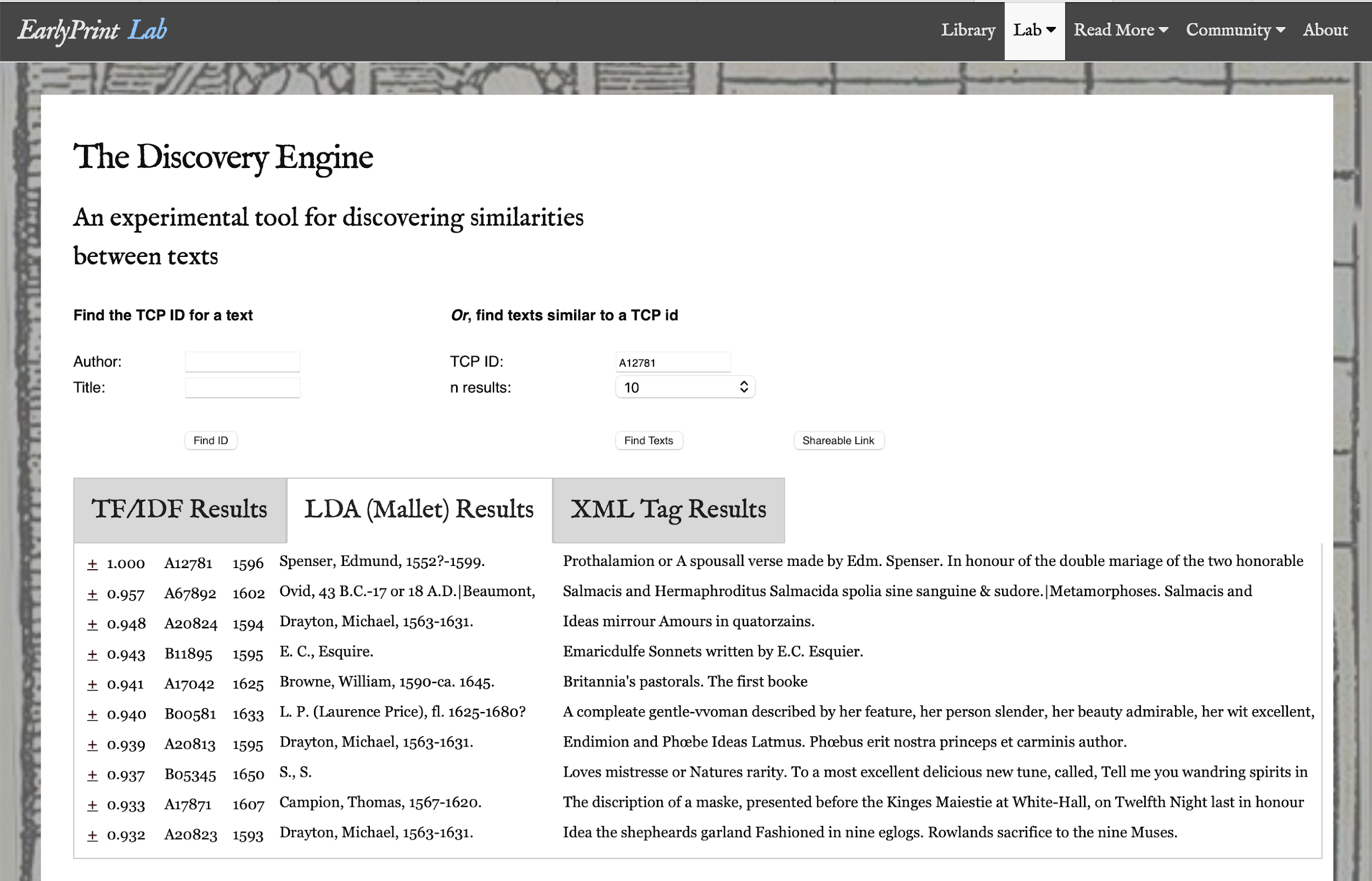 The reappearance of a simple phrase may or may not indicate any pervasive similarity among different texts or different authors. For that, we would need to turn to “ The Discovery Engine ” under the Search section of the Lab menu which, given a single text, finds other, similar texts using either relative word frequencies or structural mark-up (such as the division of a play into acts and scenes) as its inputs. The output is a list of texts in which the selected features have been reduced to a similarity coefficient indicating how similar each text is to the source text, ordered from most similar to least. Entering the Prothalamion, for example, tells us that, by one word frequency measure, William Drummond has two works that appear in the top ten list of texts most similar to Spenser’s, and by another, Michael Drayton has three (see fig. 8). If we use text structure rather than word frequency, we would see that Spenser himself, via the inclusion of his own Complaints and Colin Clouts Come Home Againe, is the author whose appearance in the top ten most similar list suggests an affinity with Prothalamion. Does this mean that the structure of Spenser’s verse is more distinctive than his vocabulary? It might, but this introductory essay has no intention of spoiling the fun for those who would like to use “The Discovery Engine” to take this line of inquiry further and make their own discoveries. 19
