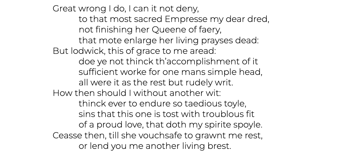 The memorializing capacity of poetry is at stake in this sonnet, if indirectly. Spenser’s speaker (an authorial persona both like and unlike the author, at once ironic and ironized) is reminded of “not finishing” The Faerie Queene, as though he had willfully forgotten his duty to the queen. But, of course, not finishing is not the same as forgetting, and to “forget” intentionally is also a way to remember. Here, I want to suggest, such forgetfulness is an ironic reminder of the importance of memory to Spenser’s poetry.